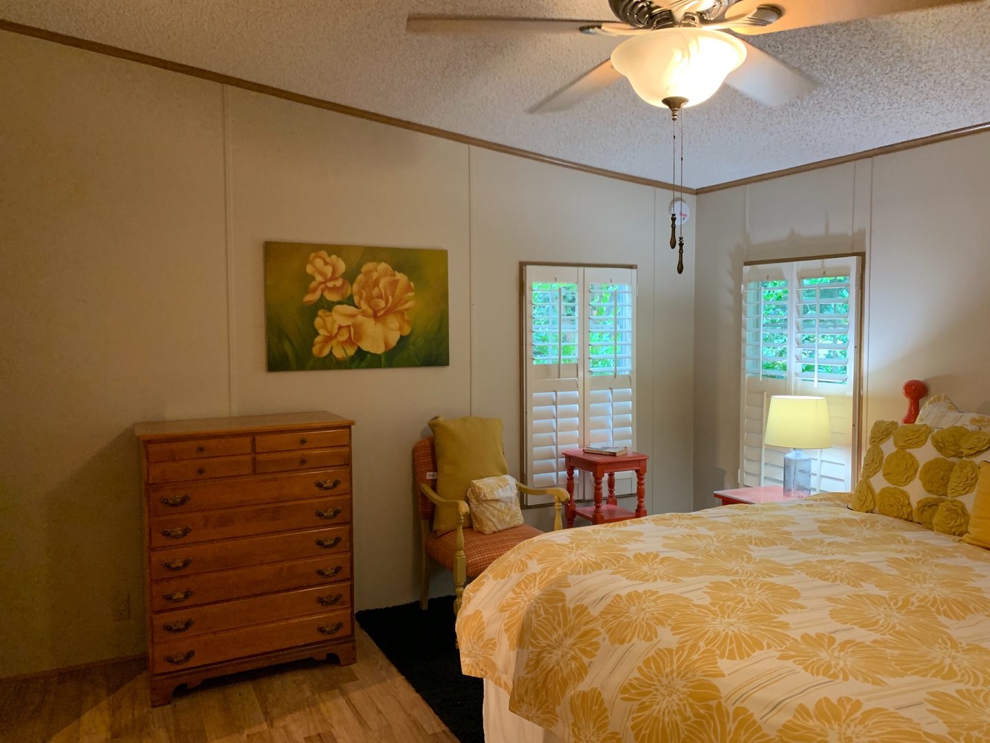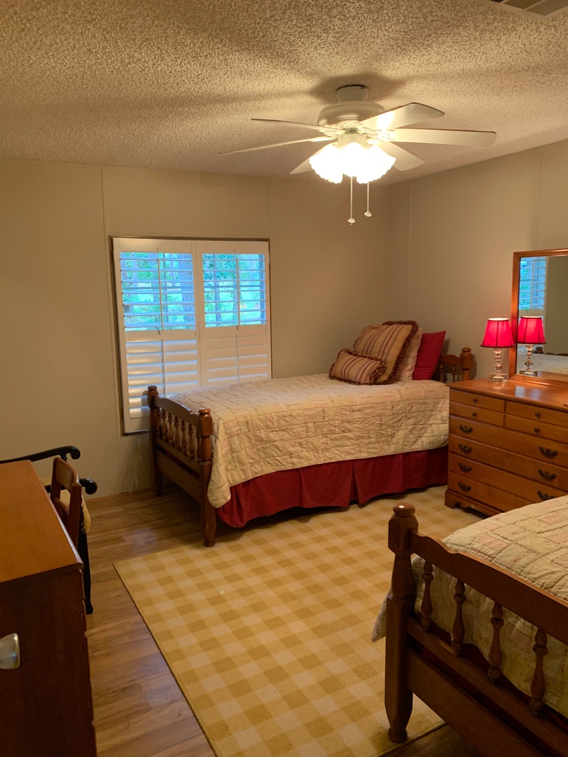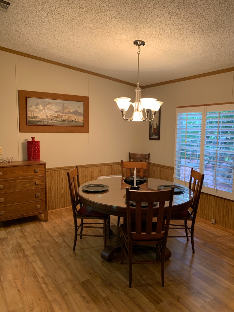 The home is adorned with custom plantation shutters and laminate flooring throughout.