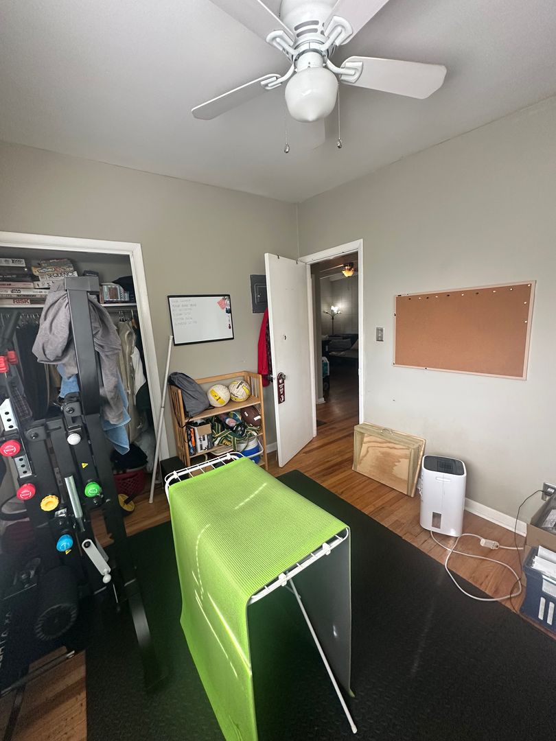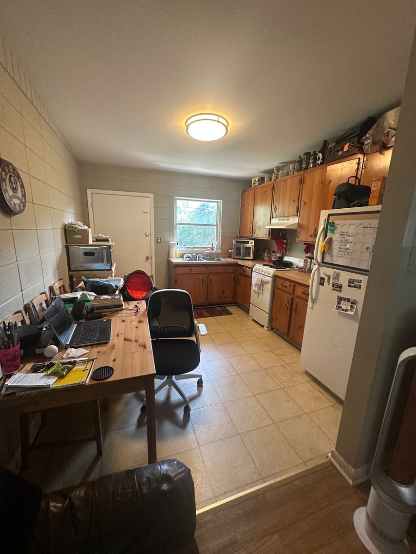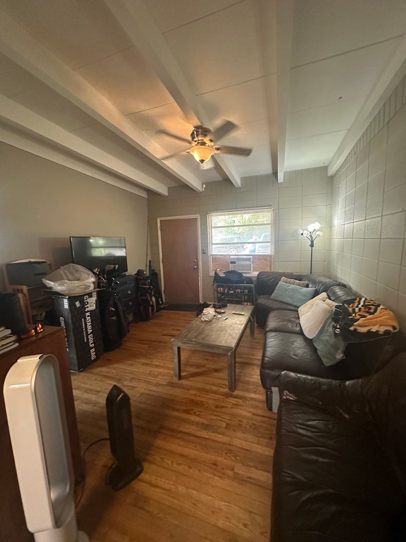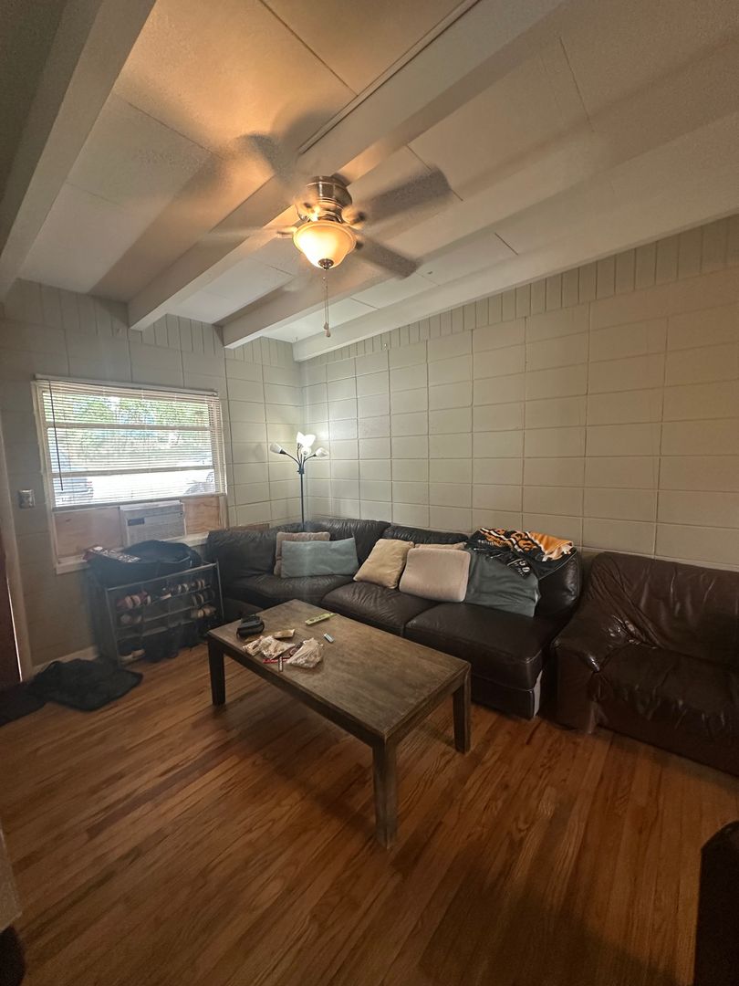 Ceiling fans and window AC units provide comfort, and shared laundry with washer and dryer adds convenience.