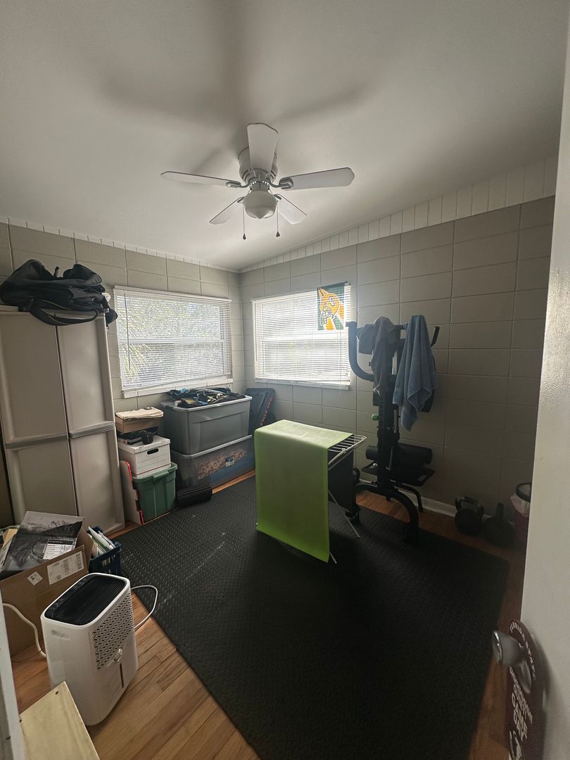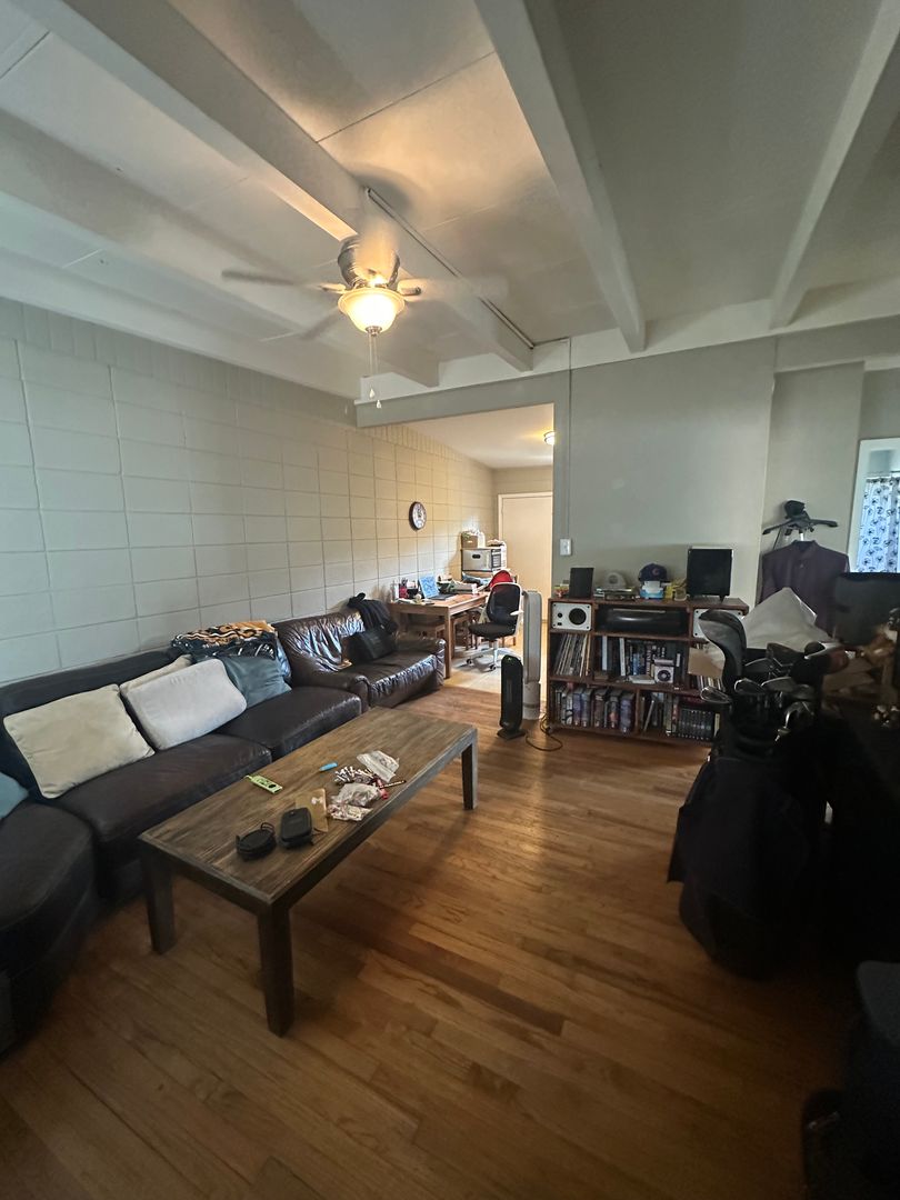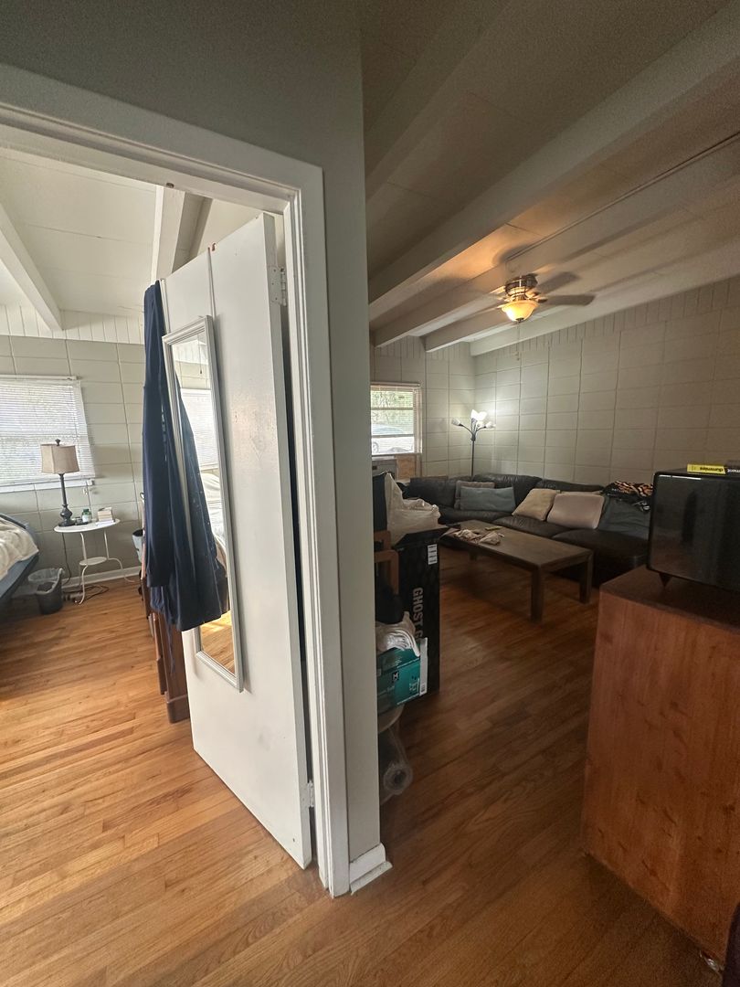 Hardwood flooring runs through the living spaces, while the bathroom features tile.